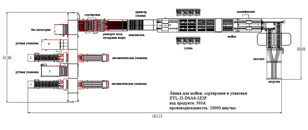 - Линия специально разработана для дезинфекции, мойки, сушки, сортировки, автоматической упаковки и маркировки яиц (опция) производительностью до 20000 яиц в час;